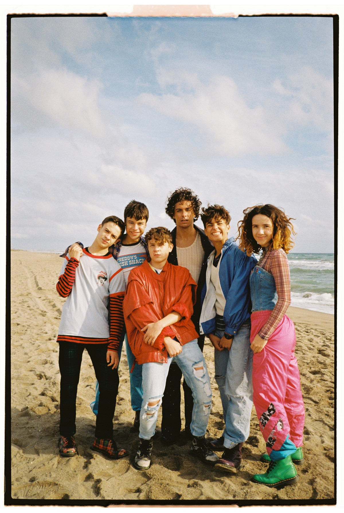 El cantant i compositor Alfred García a la platja del Prat amb els protagonistes de "Los espabilados"