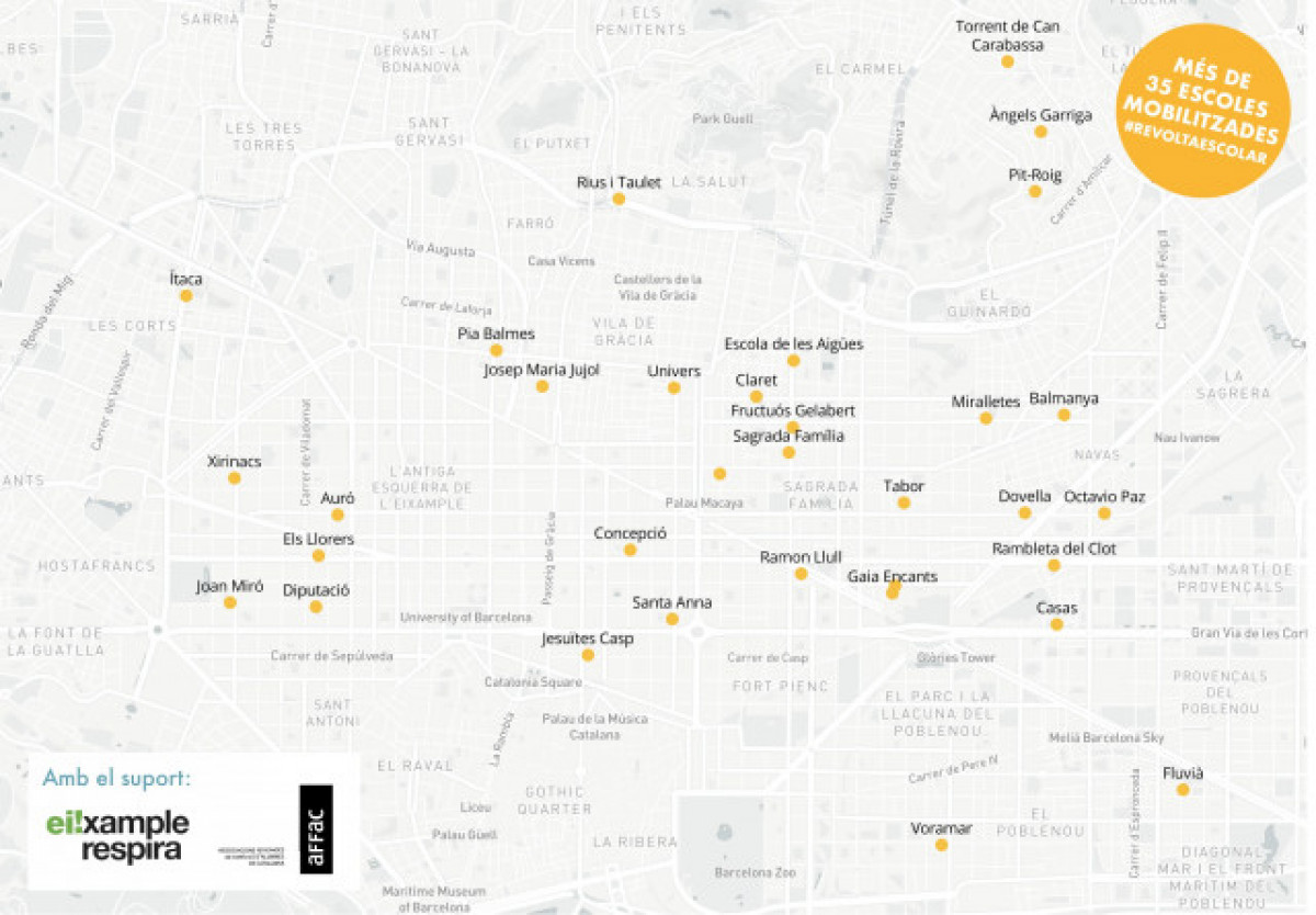 L'acció, que ha durat mitja hora, s'ha produït sense incidents. Segons ha explicat Guille López, el portaveu de l'entitat coordinadora Eixample Respira, s'han tallat vies cèntriques de la capital catalana com Numància, Aragó o València, enfront de les escoles participants.