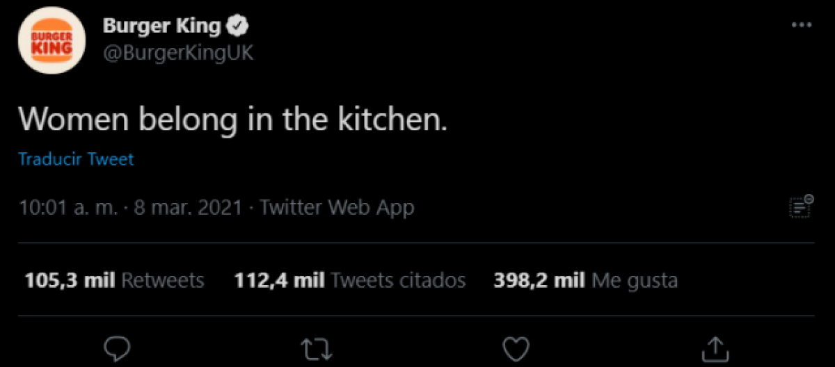 Hi ha community managers que hagués estat millor que naixessin mancos. Aquest dilluns és el Dia Internacional de la Dona i, per això, milions d'usuaris de tot el món s'han llançat a les xarxes socials per celebrar l'esdeveniment. També ho ha fet la filial britànica de Burger King al Regne Unit, però amb força mal gust: "Les dones pertanyen a la cuina" (Women belong in the kitchen, en anglès), han afirmat a través d'un tuit que recull CatalunyaPress.