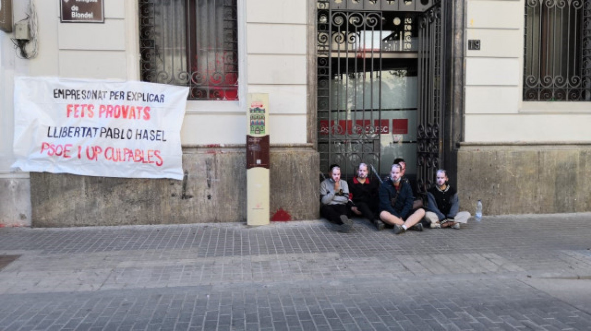 Amb màscares amb la cara de Hasel, aquestes cinc persones estan encadenades al costat un cartell que diu: 'Empresonat per explicar fets provats. Llibertat Pablo Hasel. PSOE i UP, culpables '.