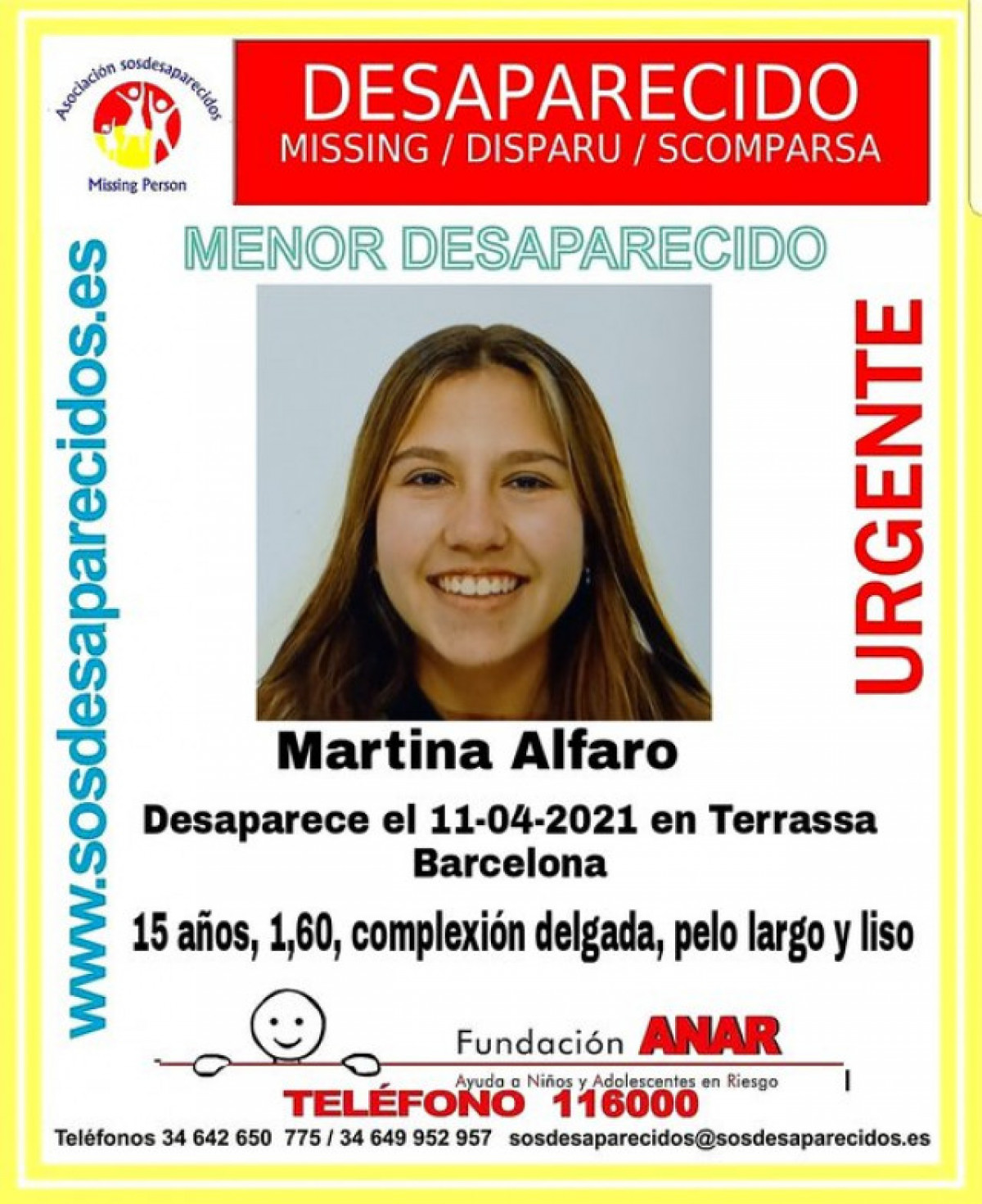 La Martina, la menor de 15 anys que va desaparèixer aquest diumenge a Terrassa, ha estat localitzada, segons ha informat l'Associació SosDesaparecidos.