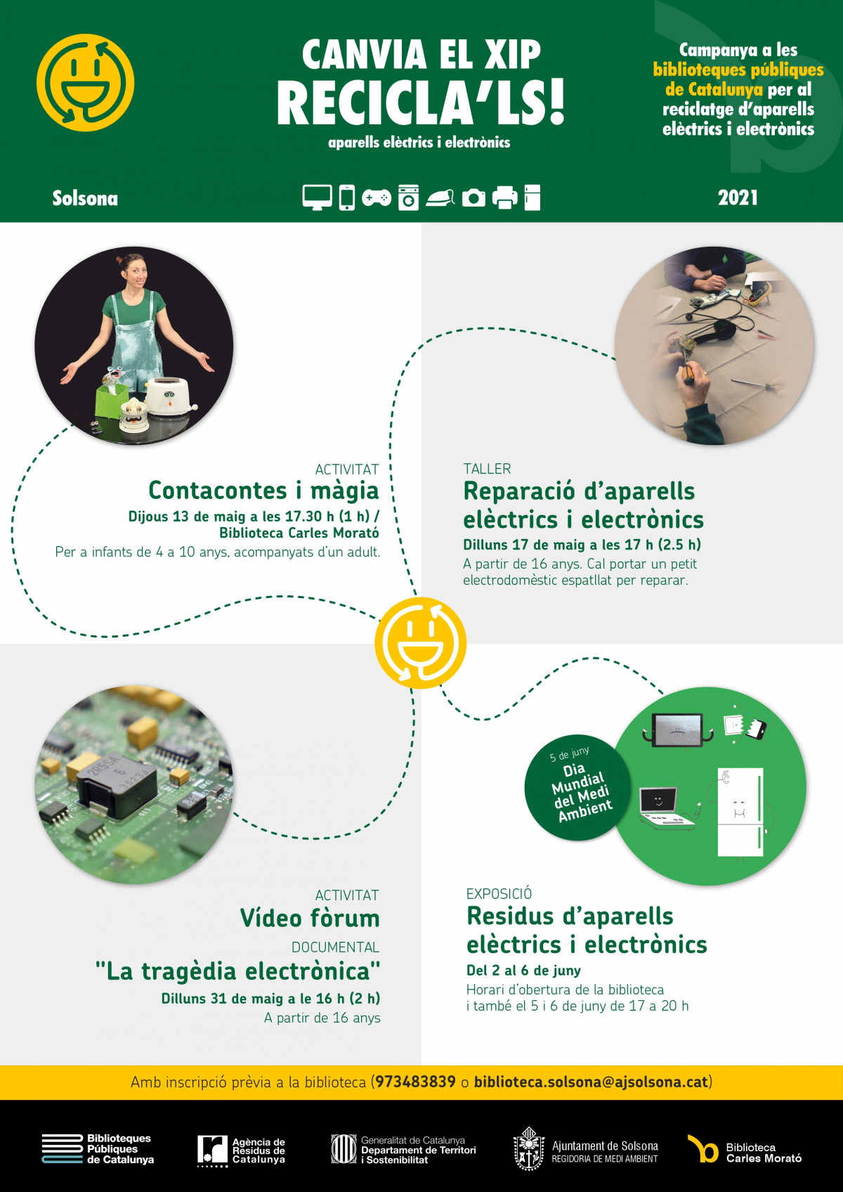 Amb l’objectiu d’intensificar la participació de la ciutadania en la reducció de residus i que es conscienciï sobre la recollida selectiva i el reciclatge d’aparells elèctrics i electrònics, la Carles Morató de Solsona és una de les 68 biblioteques del país que s’afegeixen a la campanya “Canvia el xip. Recicla’ls”. Entre el 13 de maig i el 6 de juny convida infants, joves i adults a una sessió de contacontes, un taller de reparació d’aparells, un videofòrum i una exposició. A les tres primeres propostes, cal inscriure-s’hi per les limitacions de capacitat.