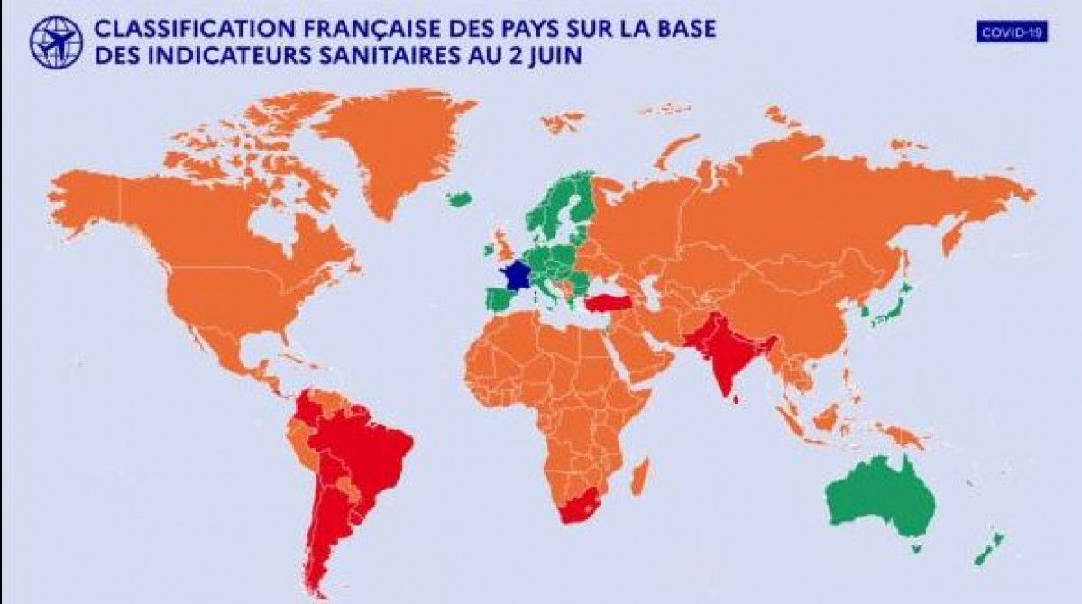 Finalment, el color vermell s'aplica als països amb circulació activa de virus, i / o presència de variants preocupants. És el cas d'Argentina, Bahrain, Bangla Desh, Bolívia, Brasil, Xile, Colòmbia, Costa Rica, Índia, Nepal, Pakistan, Sud-àfrica, Sri Lanka, Surinam, Turquia i Uruguai. Els viatgers procedents d'aquests països, estiguin o no vacunats, han de justificar un motiu imperiós per entrar al territori francès.