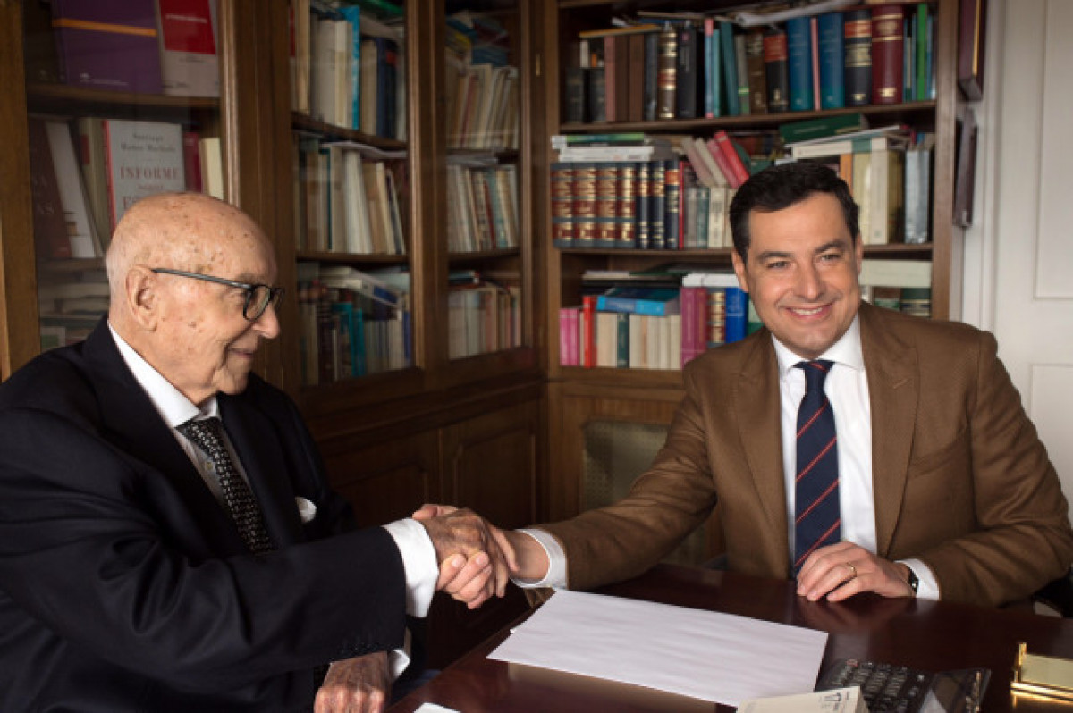 Arxiu - El president de la Junta d'Andalusia, Juanma Moreno, i l'exministre d'UCD Manuel Clavero, en una imatge d'arxiu. - PP-A - Arxiu EP
