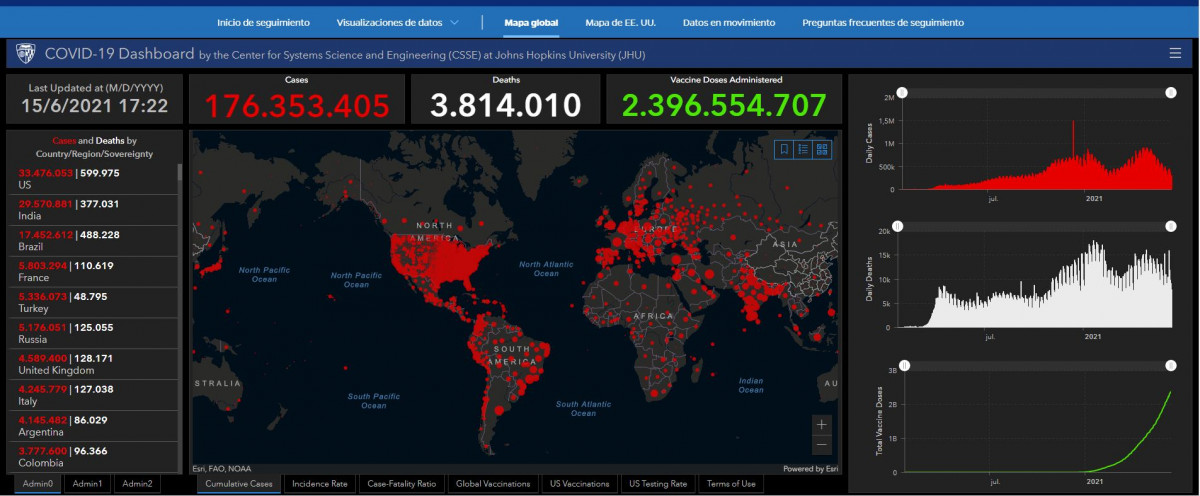 També podreu comprovar que el Covid ens deixa aquest mapa de món reflectit per la Universitat de Hopkins amb 3,8 milions de persones mortes en el que va de pandèmia, 176 milions de persones infectades i 2.396.000 de persones salvades. I això tornen a ser dades que no "invents".