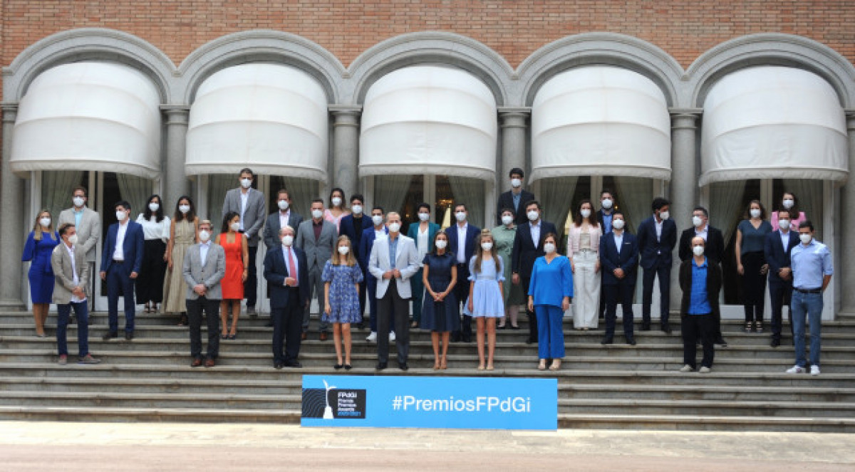 La Família Reial ha realitzat un breu recorregut amb la trentena de premiats i han realitzat un posat en una de les escalinates del palauet per a la premsa gràfica, al costat del president i la directora de la fundació, Francisco Belil i Mònica Margarit.