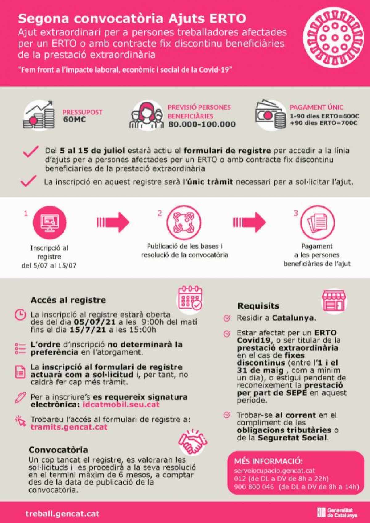 Les persones que durant els mesos de gener a maig de 2021 s'han vist afectades per un expedient de regulació temporal d'ocupació (ERTE) a Catalunya poden demanar ajuts econòmics des d'aquest dilluns dia 5 de juliol fins al proper dia 15.