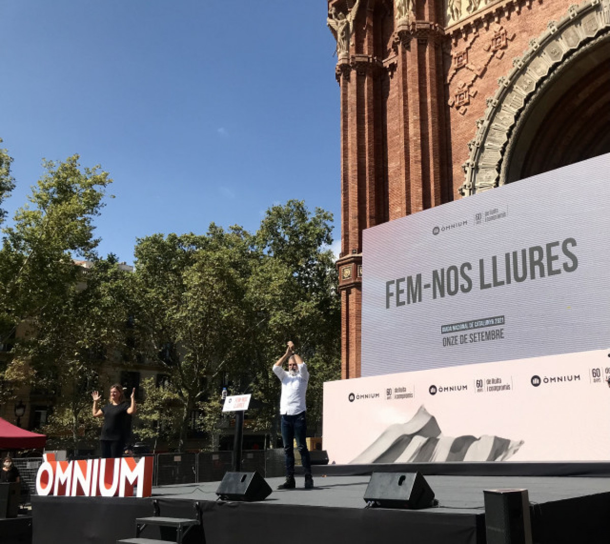 L'acte d'Òmnium d'aquesta edició de la Diada amb el lema 'Fem-nos Lliures' (Fem-nos lliures) ha estat el primer que ha pogut protagonitzar presencialment Cuixart després de sortir de presó, i al costat d'ell han acudit altres dirigents polítics indultats, com l'exvicepresident de la Generalitat i líder d'ERC, Oriol Junqueras, i els exconsellers Joaquim Forn i Josep Rull.