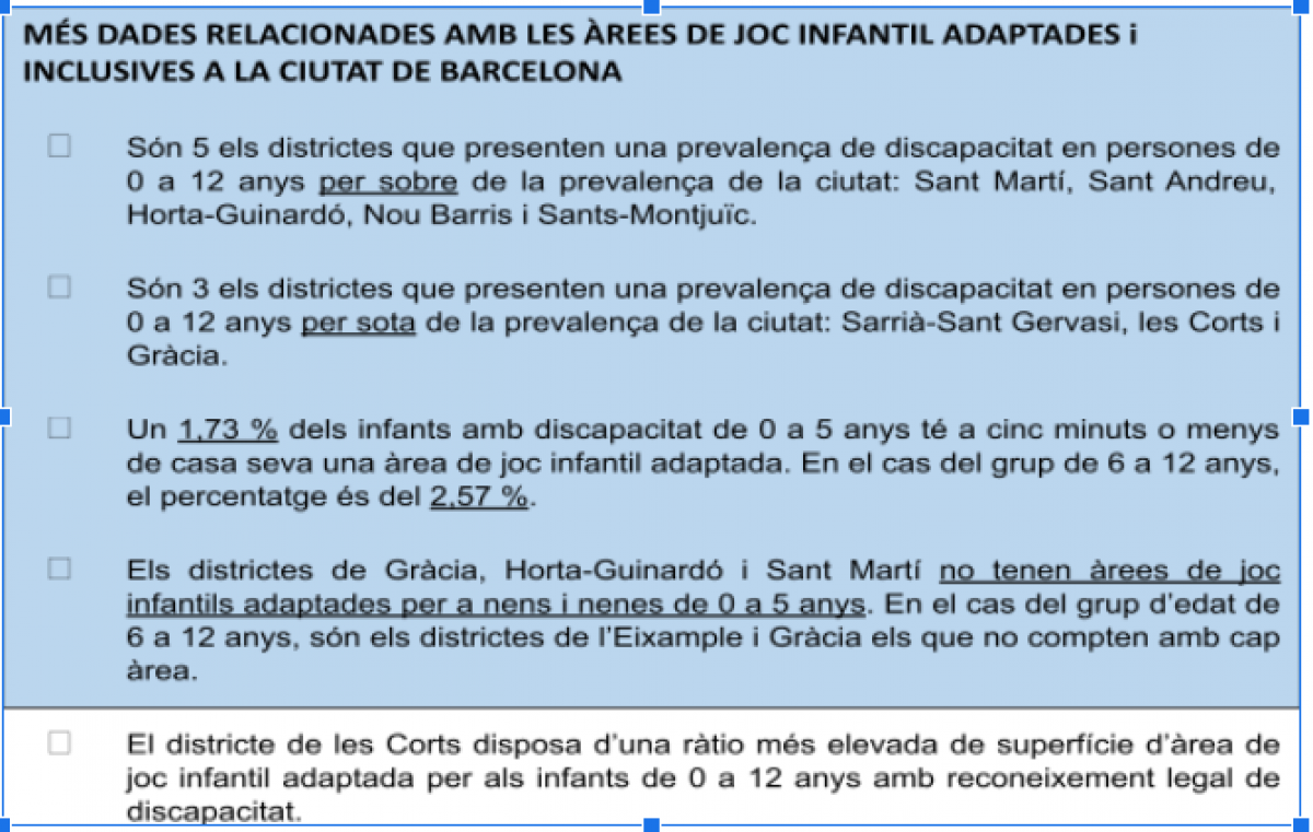 Tenint en compte els objectius perseguits en el Pla de Joc a l’espai públic de Barcelona amb horitzó 2030, no ens expliquem la raó de la inexistència de jocs accessibles o inclusius en espais lúdics de nova creació.