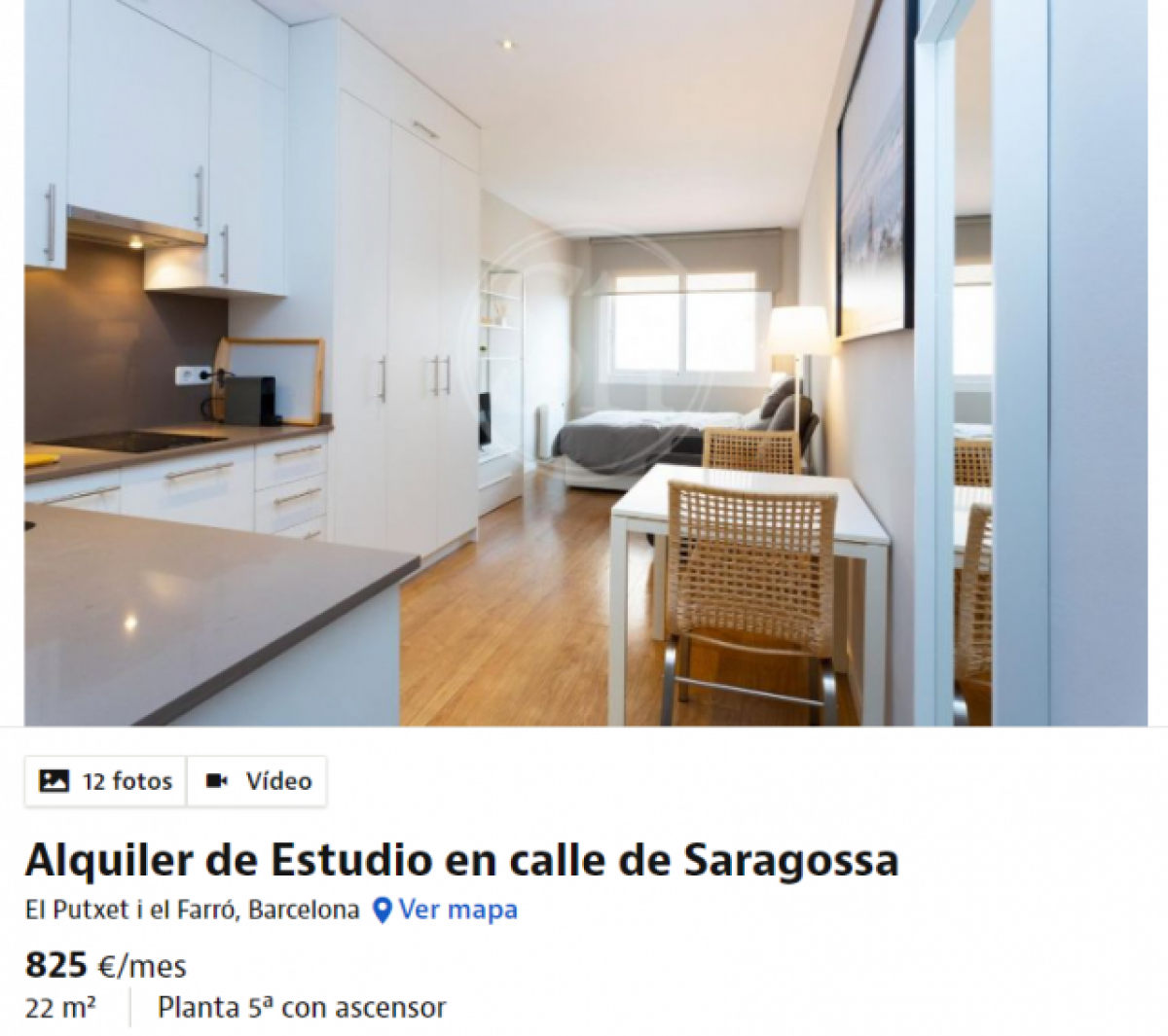 En aquest cas, ens trobem amb un pis de 22 metres quadrats que es lloga per 825 euros al mes, a 37,50 euros el metre quadrat. A l'anunci no consta el preu de l'anterior contracte ni l'índex de lloguer, que en aquest cas és de 25,89 euros el metre quadrat, i pot arribar a un màxim de 34,07 a l'àrea superior.