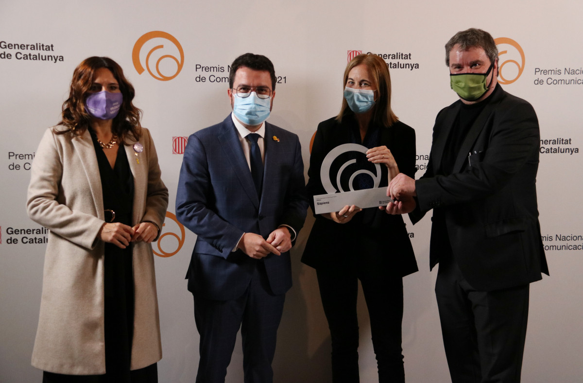 El president Aragonès i la consellera Vilagrà amb la directora de 'Sàpiens' i altres membres de l'equip, en l'entrega dels Premis Nacionals de Comunicació 2021. /@ACN