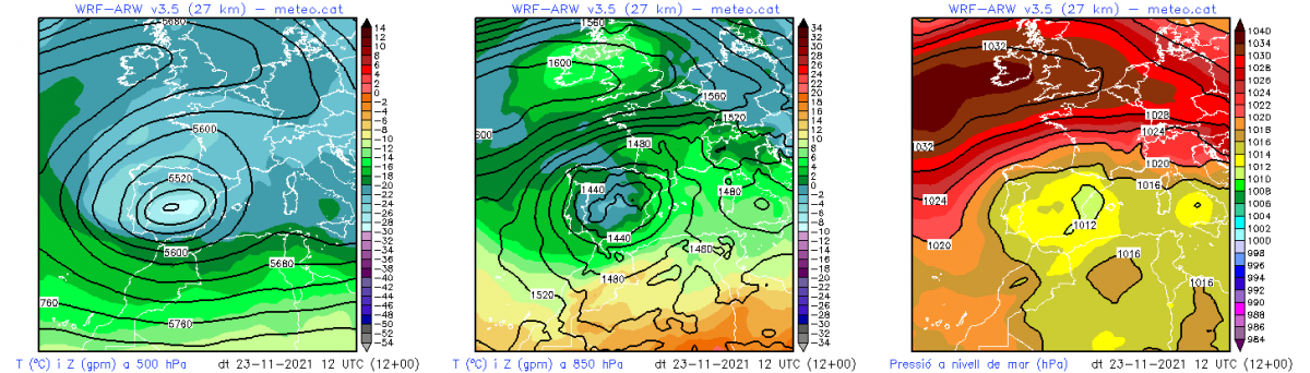 Els mapes anteriors mostren la situació del dimarts 23 de novembre al migdia. A l’esquerra, la topografia de 500 hPa (uns 5.500 m d’altitud) mostra la DANA centrada sobre la península Ibèrica. Al centre, la topografia de 850 hPa (uns 1.500 m d’altitud) mostra el vent de sud-est incidint sobre el litoral català i aportant aire relativament temperat (al voltant de +4 ºC a aquest nivell) en comparació amb l’aire més fred del centre de la península. En superfície (a la dreta), un potent anticicló a l’oest de les Illes Britàniques i baixes pressions al Mediterrani provocaven vent de llevant al litoral català, aportant humitat.