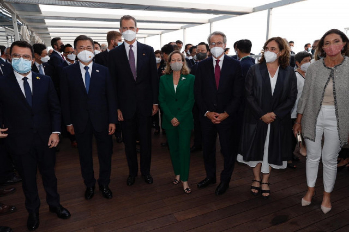 El president de la Generalitat, Pere Aragonès, el president coreà, Moon Jae In, el Rei, la vicepresidenta del Govern, Nadia Calviño, el president del Cercle d'Economia, Javier Faus, l'alcaldessa de Barcelona, Ada Colau, i la ministra Reis Maroto @ep