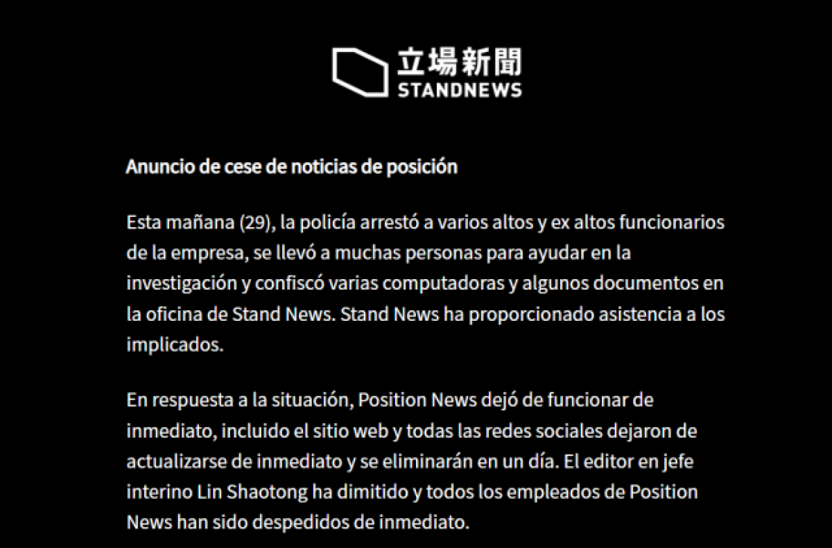 En un missatge publicat a través del seu compte a la xarxa social Facebook, 'Stand News' ha detallat que la seva pàgina web i les xarxes socials del diari "seran eliminades en pocs dies". A més, ha ressaltat que, des de la seva fundació, ha estat “compromès amb la protecció de la democràcia, els Drets Humans i la llibertat” . "Gràcies als lectors per recolzar-nos sempre", ha dit.