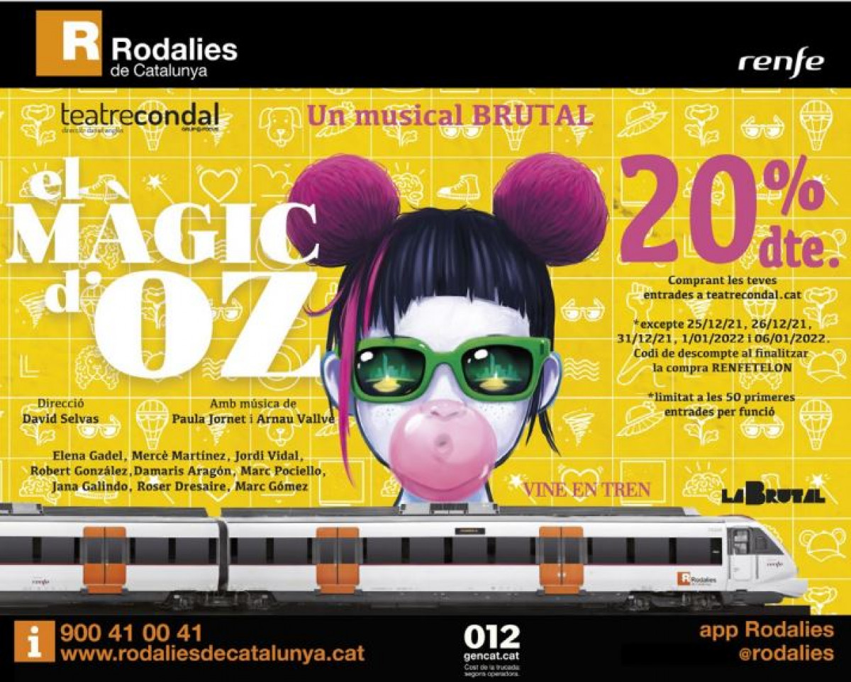 Renfe collabora amb l’espectacle musical El Màgic D’Oz al teatre Condal a Barcelona. Per fer-ho, la companyia ofereix un descompte del 20% als posseïdors d'un bitllet o abonament de Renfe - Rodalies de Catalunya per al musical ‘el Màgic d’Oz’ (oferta limitada).