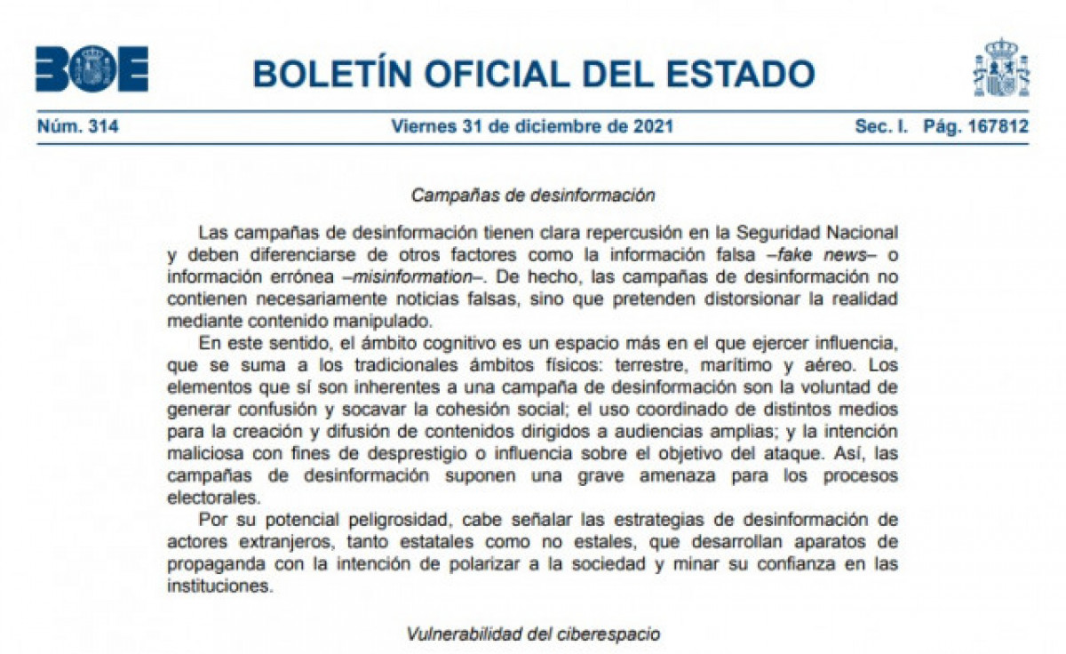 El govern de coalició conformat pel PSOE i Podem, que diuen representar la política progressista del país, ha inclòs al BOE el 31 de desembre de 2021 aquest article. Aquest Reial decret permetrà al Govern fer un seguiment exhaustiu del qual publiquen els mitjans de comunicació i seran ells el que determinin quins seran "Fake News" intervenint en la seva publicació o no.