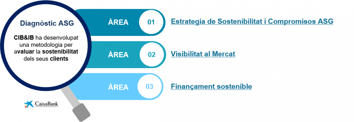CaixaBank, com a entitat financera, assumeix el seu paper de canalitzador de finançament i promou la inversió amb l'objectiu d'impulsar la transició dels seus clients cap a la neutralitat en carboni. A través de la seva àrea Structured Finance - Sustainable Finance de CIB (Banca Institucional i Corporativa), facilita un procés d'assessorament ASG per als seus clients per ajudar-los a desenvolupar el seu pla de sostenibilitat integral i adequar el seu finançament a les necessitats específiques del seu camí de descarbonización.