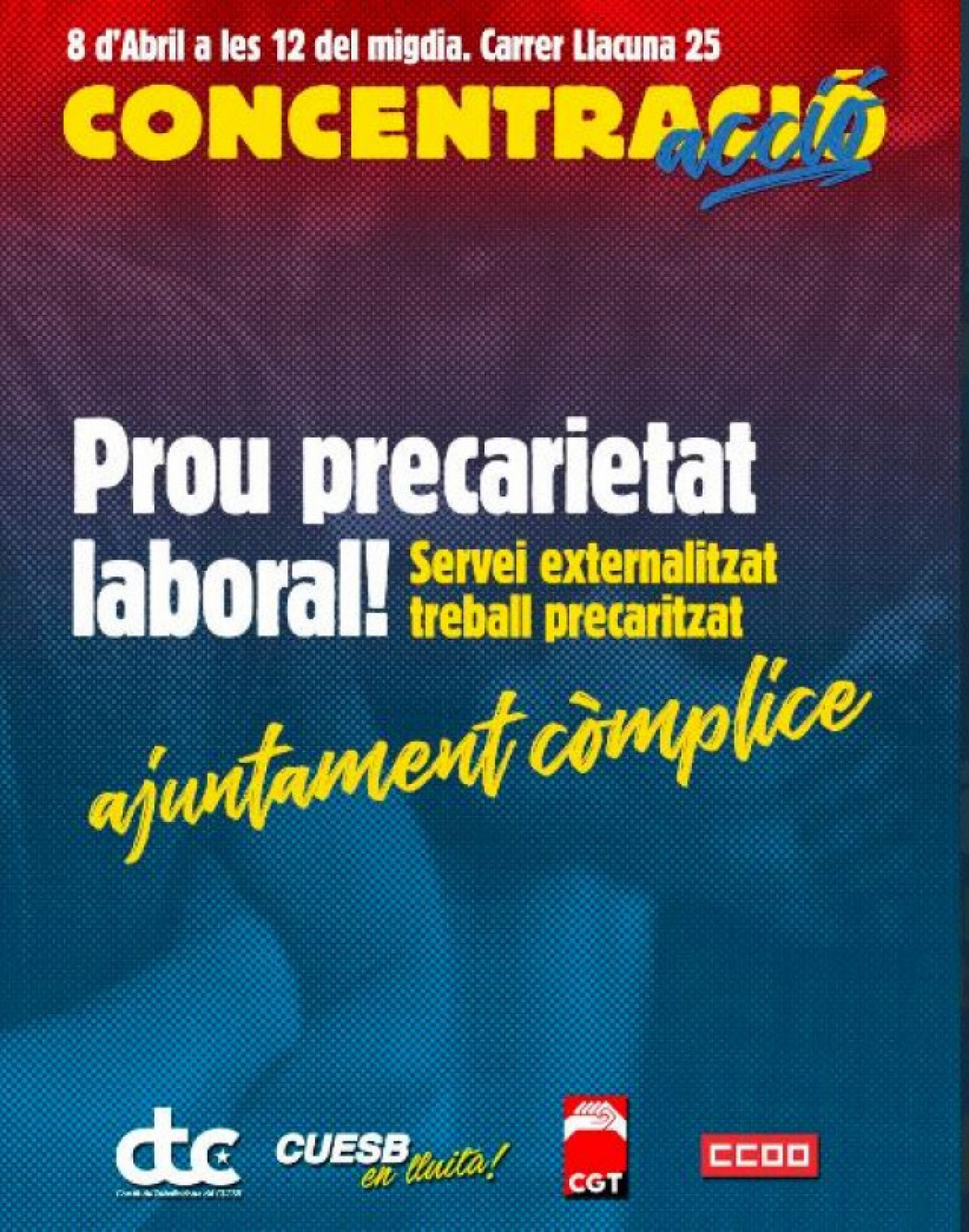 Els treballadors del Centre d'Urgències i Emergències Socials de Barcelona (CUESB) s'han concentrat aquest divendres, 8 d'abril, a les 12:00 ha les portes del seu lloc de treball per demanar que des de l'Ajuntament posin fi a la "precarietat laboral" ".a
