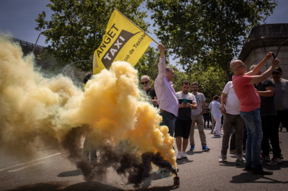 Els manifestants han llançat proclames a favor de "fer fora" els conductors de les VTC de Catalunya, han detonat petards i encès bots de fum.