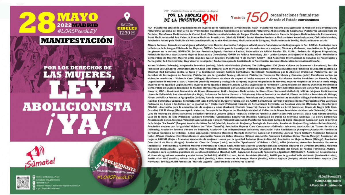 Més de cent organitzacions feministes es manifestaran aquest dissabte 28 de maig a Madrid per reclamar l'abolició de la prostitució sota el lema ' Pels drets de les dones, llei abolicionista, JA!' . Les entitats reclamen l'aprovació de la Llei Orgànica Abolicionista del Sistema Prostitucional (LOASP), la proposta legislativa elaborada per la Plataforma d'organitzacions de dones per l'Abolició de la Prostitució (PAP).