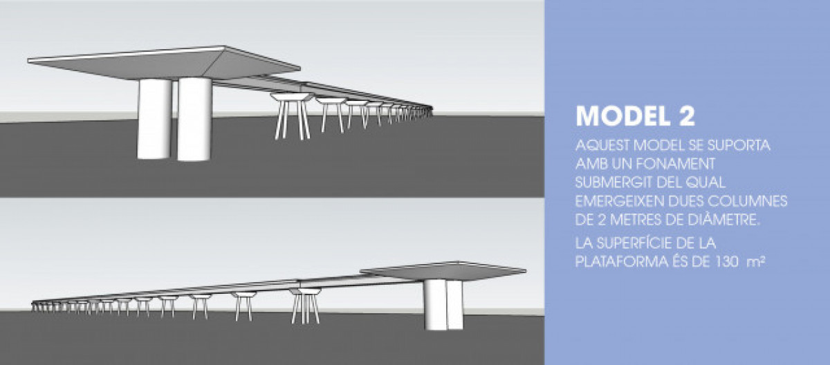 El temporal Gloria va provocar el gener de 2020 danys importants al litoral de Badalona, i en concret, danys a l'estructura d'aquest pont i la desaparició de la part final del passador que unia el pont amb la plataforma final, i els models portats a són els que tècnicament poden suportar millor l'acció de l'onatge en situació de temporal, ha explicat el consistori.