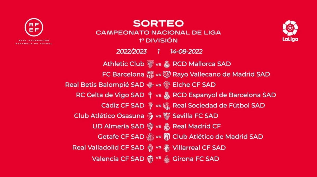 El campionat de lliga arrencarà el cap de setmana del 13-14 d'agost i acabarà el 4 de juny del 2023, més tard del que és habitual a causa de l'aturada a l'hivern pel Mundial de Qatar. El primer Barça-Madrid de LaLiga serà el 16 d'octubre al Santiago Bernabéu.