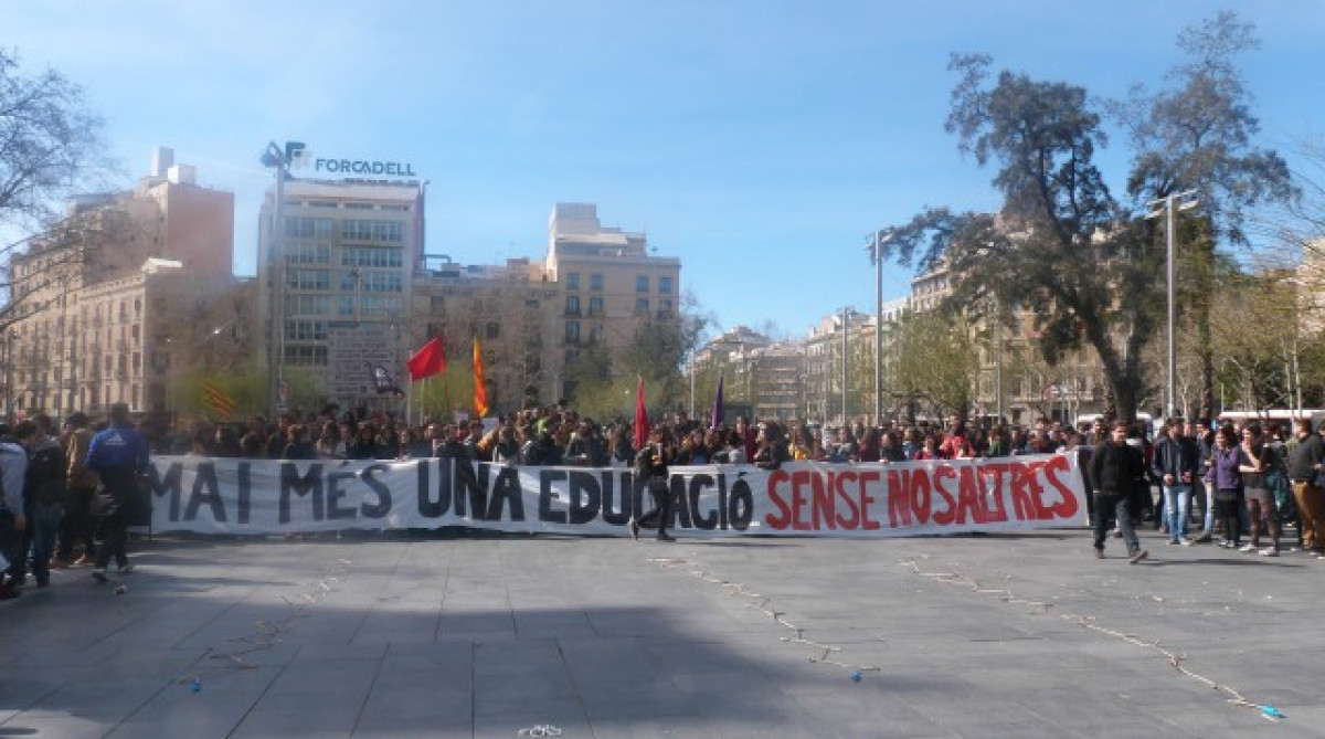 Centenars d'estudiants s'han manifestat aquest migdia des de la plaça Universitat de la capital catalana, contra el decret '3 + 2', que proposa tres anys de grau i dos de màster, a més de la Llei orgànica de millora de la qualitat educativa (Lomce ).