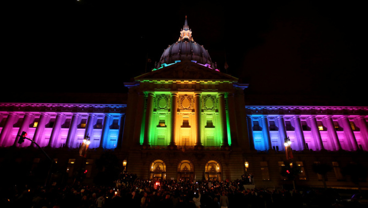 (Foto: un edifici oficial de San Francisco il·luminat amb els color de la bandera gai durant la vetlla en record de les víctimes)