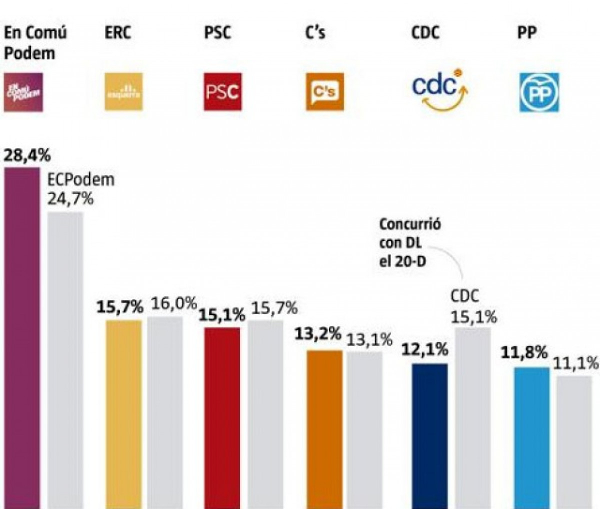 Els socialistes podrien caure una mica més de mig punt, el que els costaria un diputat dels vuit amb què compten actualment. En canvi, Ciutadans i, sobretot, el PP resistirien a l'alça pel que podrien afegir un diputat més al seu còmput de desembre (i passar de 5 a 6 en els dos casos). PP i PSC obtindrien els seus millors resultats entre els majors de 45 anys, mentre que ECP i Ciutadans ho farien entre els electors compresos entre els 18 i els 44 anys.