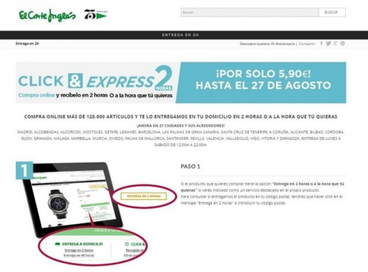 D'aquesta manera, entre l'1 i el 27 d'agost de 2016, els clients que realitzen les seues compres en línia, a més de poder triar entre rebre la mercaderia en almenys dues hores o al mateix dia a la franja horària seleccionada, podran gaudir d'una rebaixa d'un 25% en el preu del servei d'enviament.