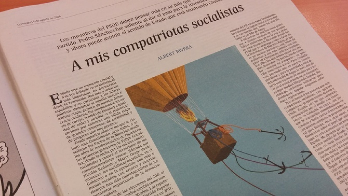 Per a això, Rivera argumenta que els ciutadans encara no han volgut un canvi al govern, però si al Congrés. "En política, com en altres facetes de la vida, moltes vegades ens toca escollir entre la solució dolenta i la menys dolenta", escriu. "Des d'una oposició responsable i no populista, tant el PSOE com Ciutadans podem exercir un paper clau per a l'estabilitat i el progrés d'Espanya", assenyala.