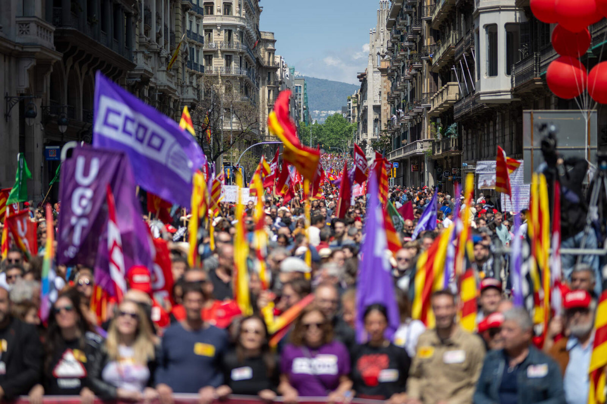 Uns 5.000 manifestants, segons la Guàrdia Urbana de Barcelona, han participat aquest dimecres al migdia a la manifestació conjunta de CCOO. i UGT de Catalunya per l'1 de maig, una xifra que puja a 10.000 participants segons els dos sindicats.