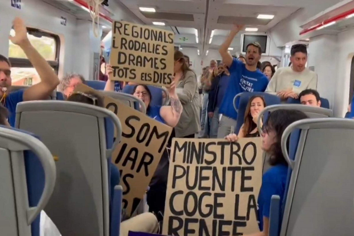 Les persones congregades han portat cartells amb consignes com "Dignitat a les vies", "Ministre Pont, agafa la Renfe" o "No som guanyat, trens dignes ja", i alguns han arribat al lloc amb tren, protestant també dins de els combois.