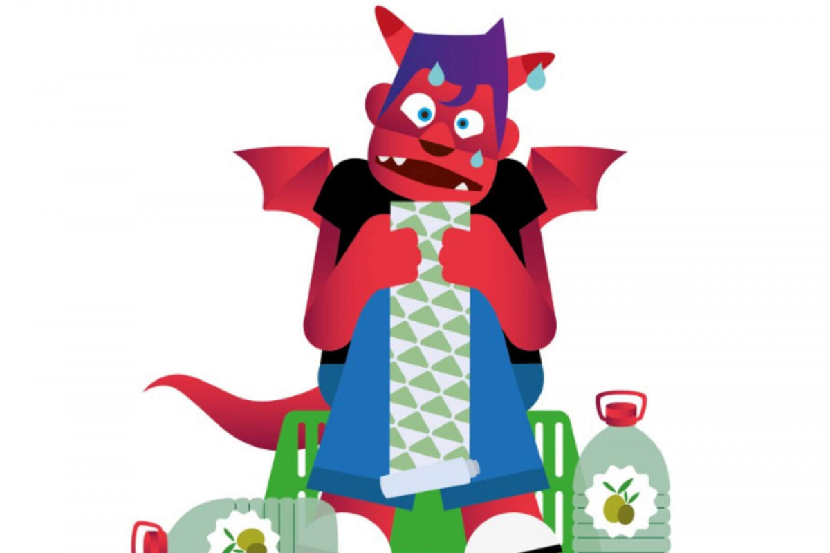 La cara del Domini mostra el pànic en veure les xifres que reflecteixen els tiquets de la compra del supermercat, il·lustrat de manera molt eloqüent amb un dels productes que més n'ha apujat el preu. És l'oli d'oliva, amb 2 garrafes gairebé buides al peu de la figura.