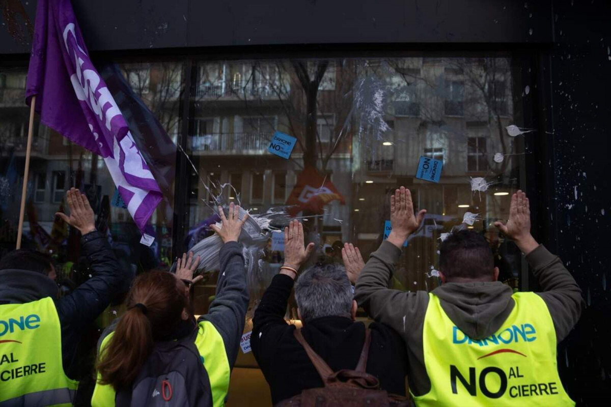 Unes 250 persones han llançat aquest dilluns iogurts i ous, han encès bengales i han posat adhesius a la seu de Danone España a Barcelona. Ho han fet per protestar contra el tancament de la planta a Parets del Vallès (Barcelona).