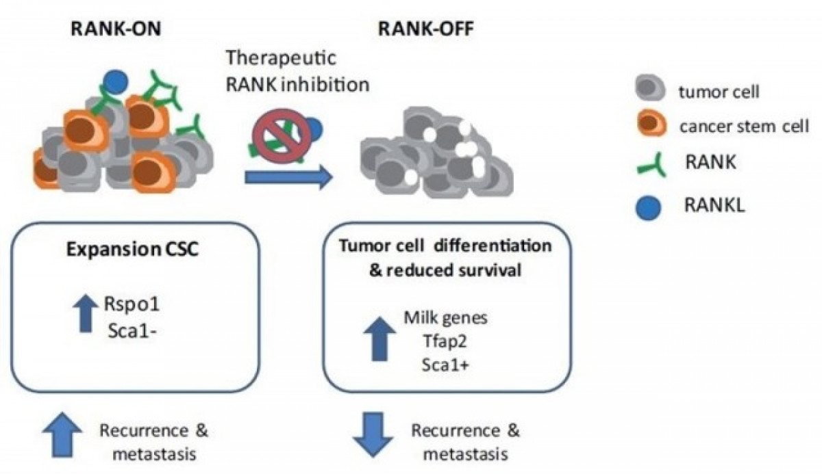 Les cèl·lules precursores de càncer o cèl·lules mare cancerígenes expressen alts nivells de la proteïna RANK i, de fet, la mortalitat en el càncer de mama es deu principalment a les cèl·lules d'aquest tipus que sobreviuen als tractaments i que són responsables de la recurrència del tumor i de la metàstasi.