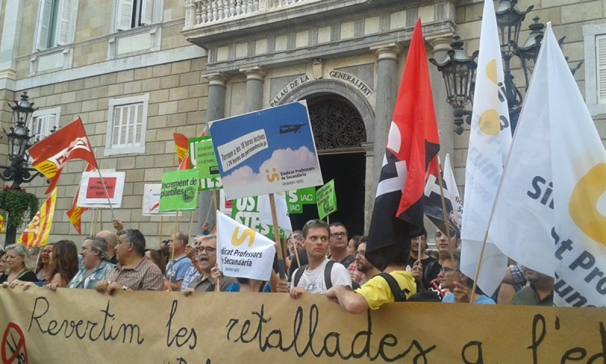 Prop de 200 persones s'han concentrat aquest dimarts a la plaça Sant Jaume de Barcelona per reclamar "revertir les retallades" i demanar al Govern que fixi l'educació pública com una de les prioritats en els seus Pressupostos.