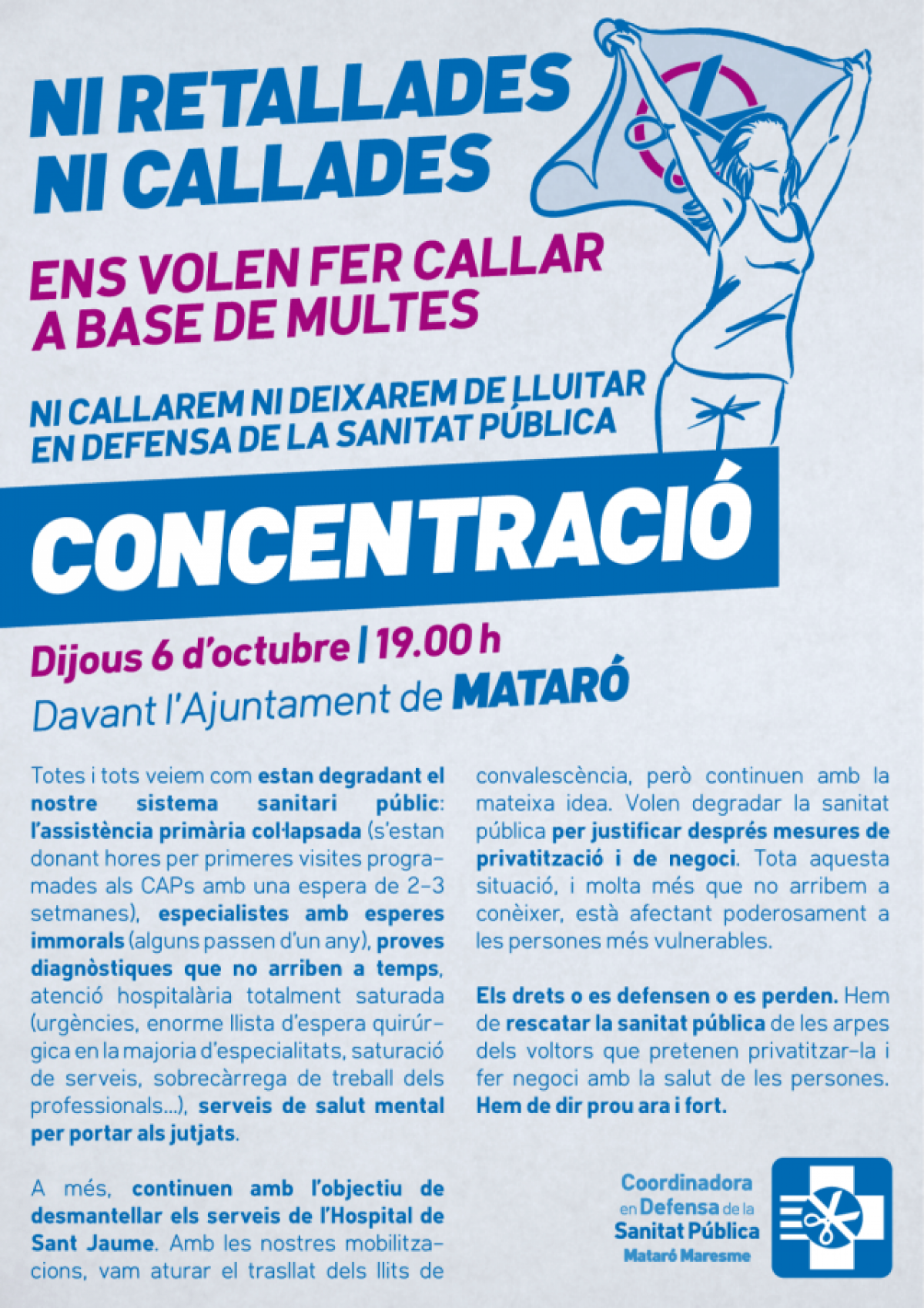 CatalunyaPress.- La Coordinadora en Defensa de la Sanitat Pública de Mataró i Maresme ha convocat una concentració davant de l'Ajuntament de Mataró (Barcelona) aquest dijous 6 d'octubre a les 19.00 hores. El motiu: protestar contra la "degradació" del sistema sanitari públic . L'alcalde de Mataró és David Boti, del PSC.