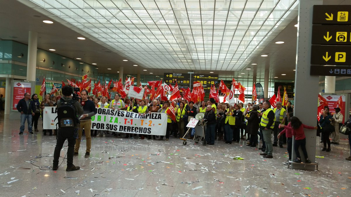 Desenes de treballadors s'han manifestat a l'interior i l'exterior de les terminals T-1 i T-2 amb pancartes i han omplert el terra de papers i d'adhesius en senyal de protesta, en l'inici d'una vaga que durarà fins al divendres 2 de desembre.