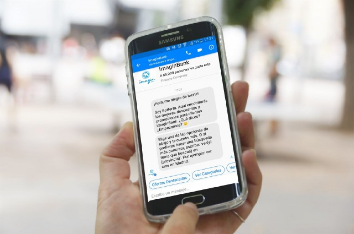 ImaginBank, el banc exclusivament mòbil de CaixaBank, ha apostat per la intel·ligència artificial amb el llançament del primer 'chatbot' del sector financer a Espanya, que dialoga amb els clients a través de text i veu per ajudar-los a triar les propostes del seu programa de ofertes i promocions que millor s'ajusten al seu perfil d'interessos i lloc de residència.