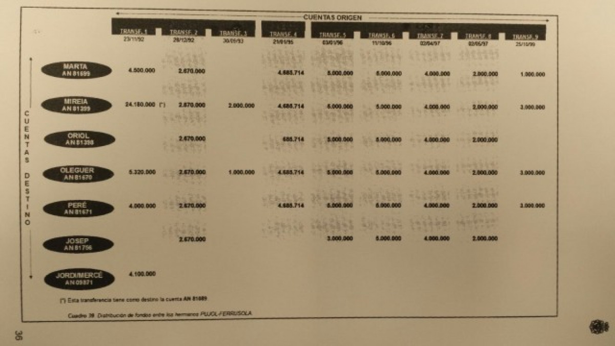 Els agents plasmen les seves conclusions en un quadre en el qual s'aprecia que la germana que més fons va rebre durant el període va ser la Mireia, que va comptar amb disposicions d'entre 2 i 24,1 milions de pessetes. La segueixen en ingressos Oleguer i Marta.