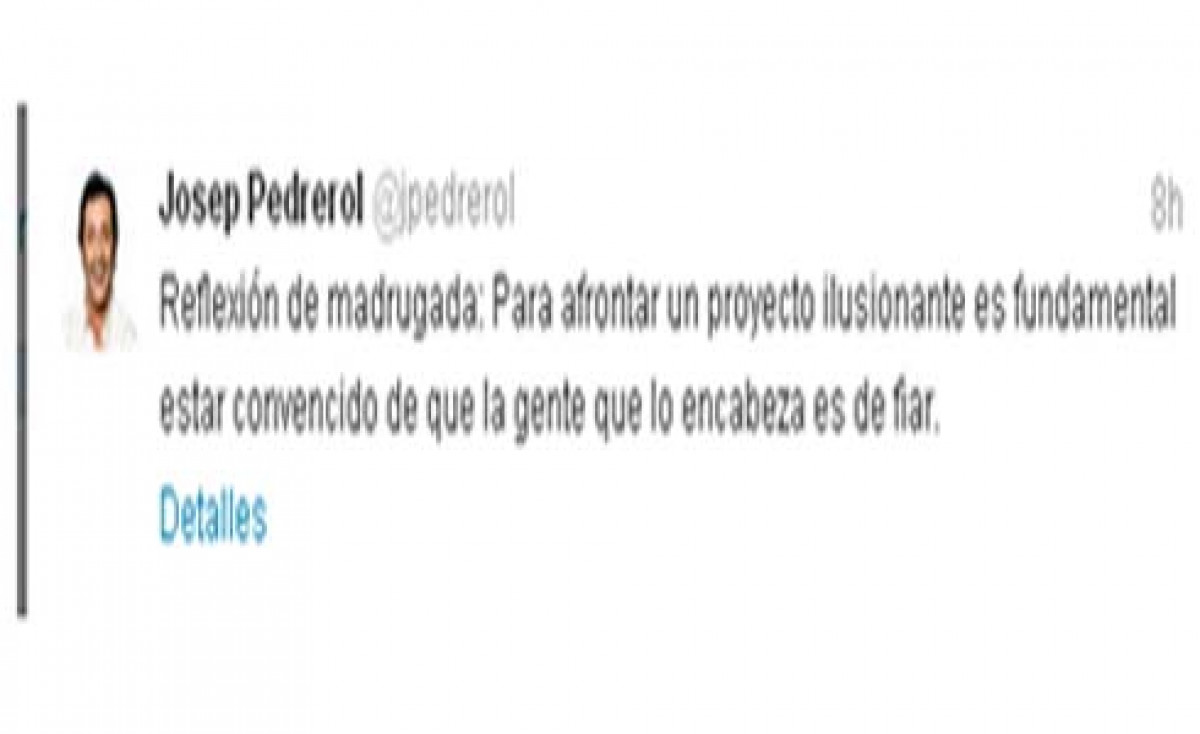 Josep Pedrerol, director i presentador de "Punto Pelota", reflexionava aquest matí en Twitter: 'reflexió matinada per afrontar projecte il·lusionant és fonamental estar convençut que la gent que ho encapçala és de fiar' confirmant així oficialment que es marxa d'Intereconomía després d'impagaments de més de 300.000 euros, al mateix temps que anuncia un fitxatge imminent per la seva nova casa 13 TV.