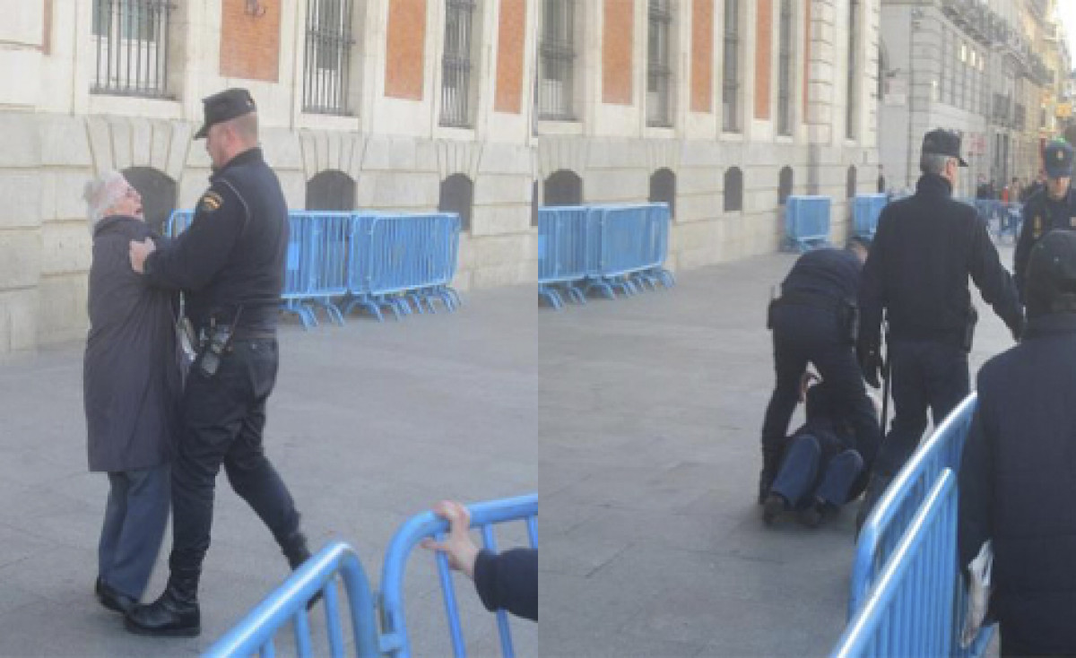 Sembla ser que Angustias anava des de la Plaça de Celenque, ja desallotjada en la matinada per la UIP fins a Sol per reunir-se amb membres de la Plataforma Stop Deshaucios que estan allí acampats. A manera de protesta van començar a escombrar el carrer i aquest polícia va voler detenir a aquesta dona d'avançada d'edat amb molt males maneres, causant-li un estat de "tristesa" segons el relat d'un testimoni presencial del "indecorós acte" d'aquest valent membre del cos de seguretat de l'estat. I tot això mentre els present li increpaven davant aquest "acte que ha estat molt fort" que li demanaven que "deixés a la senyora".