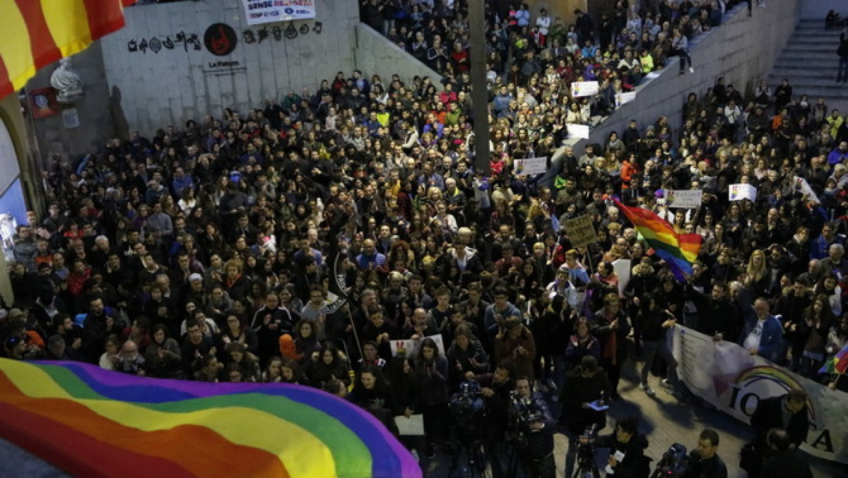 La concentració s'ha convocat per condemnar la pallissa que van rebre dos joves homosexuals de la localitat quan van fer-se un petó dissabte a la nit a les portes d'un bar | Ja hi ha un detingut per l'agressió.