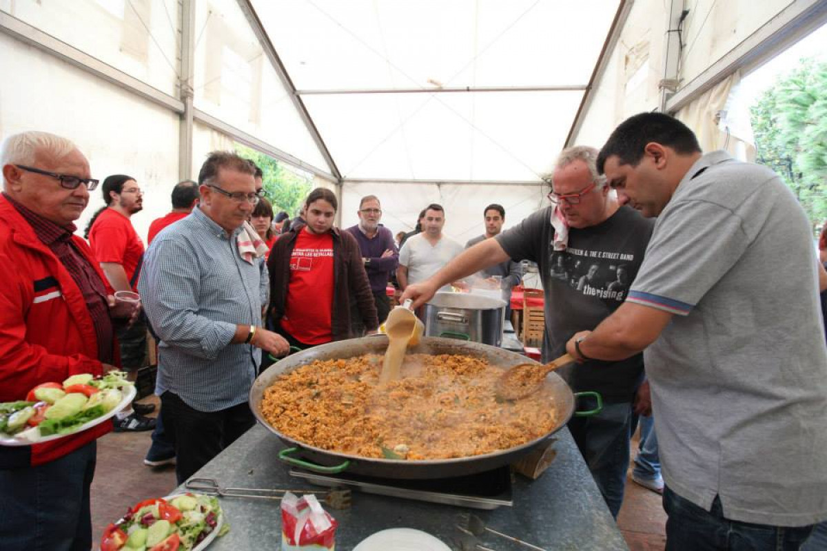 A l'esquerra Joaquín Guerrero (camisa blava) amb Ricard Campàs (posant aigua a l'arròs) a l'estand del PSC de la Festa Major de 2013 (font: Facebook PSC Viladecans)