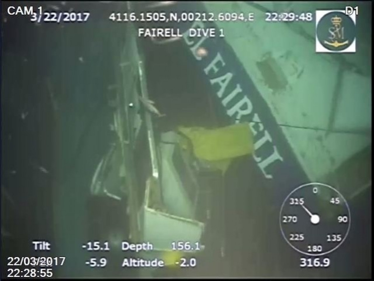 El robot ROV Comanche de Salvament Marítim ha captat les primeres imatges de les restes del pesquer El Fairell enfonsat a uns 160 metres en aigües de Barcelona després d'un abordatge amb un vaixell rus aquest dilluns, mentre segueixen desapareguts dos mariners.