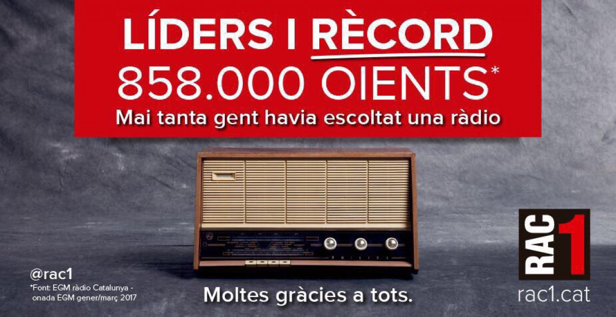 La suma de les audiències de RAC1 i Catalunya Ràdio situa el consum de ràdio en català en el milió i mig de persones. L'emissora del grup Godó acumula una audiència de 858.000 oients diaris. Catalunya Ràdio, 632.000 i al darrere, la SER, amb 346.000.