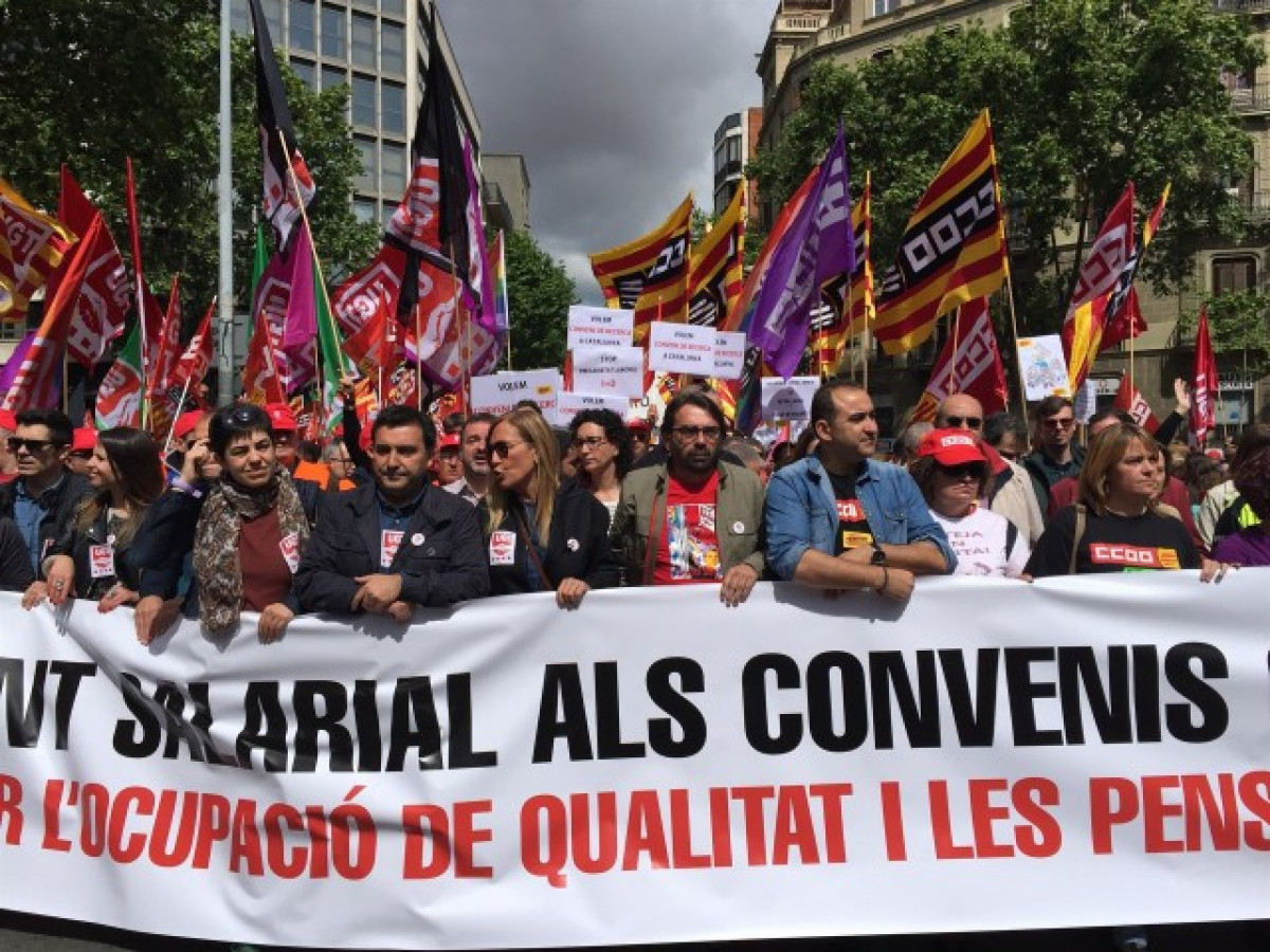 Milers de persones, 50.000 segons els sindicats i 5.000 segons la Guàrdia Urbana, s'han manifestat aquest dilluns a Barcelona per reivindicar una pujada dels salaris i la recuperació dels drets retallats durant la crisi, en commemoració del Dia del Treballador. Els líders sindicals han advertit a la patronal que "el conflicte està servit" si no hi ha augment salarial.