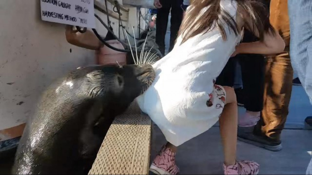 Una nena i un home comentaven l'enorme que era un lleó marí que nedava al port. Des del moll visualitzaven com cada vegada s'acostava més mentre ells li llançaven molles de pa i li feien gestos.