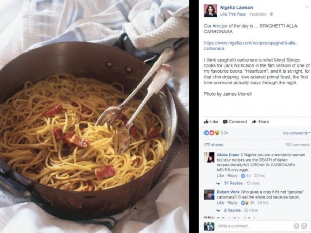 No és la primera vegada que un conegut xef britànic canvia un plat mediterrani, causant l'enuig dels nadius. Aquest cop, la televisiva xef Nigella Lawson (que dirigeix un programa de cuina) va voler fer pasta carbonara i compartir la seva particular recepta amb els seus seguidors. El problema va aparèixer quan va afegir crema a la salsa.